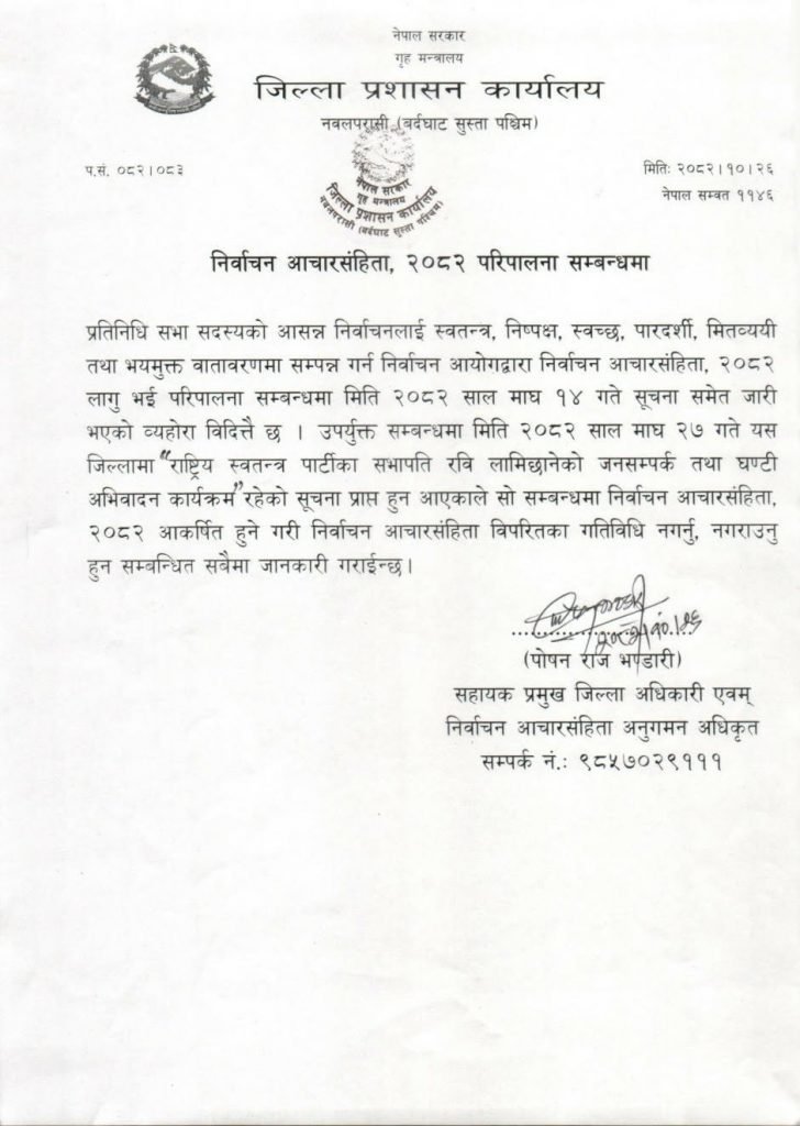 जिल्ला प्रशासन कार्यालय नवलपरासी (बर्दघाट सुस्ता पश्चिम)ले आसन्न प्रतिनिधिसभा सदस्य निर्वाचनलाई ध्यानमा राख्दै निर्वाचन आचारसंहिता, २०८२ को पूर्ण रूपमा पालना गर्न सबै सरोकारवालालाई आग्रह गरेको छ।